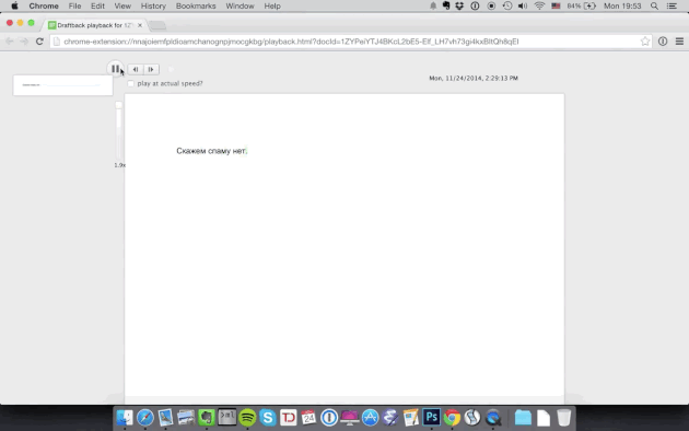 DraftВack добавляет кнопку в Google Docs, которая при необходимости создаёт видеозапись всех изменений вашего документа. С первого взгляда сплошное развлечение и только. А кто-нибудь предоставлял вам доступ к каким-нибудь документам в Google Docs? Теперь у вас в руках, а точнее в браузере, инструмент, который позволит увидеть процесс создания документа. Вы сможете окинуть взором все исправления и первоначальные мысли (если автор печатал их).