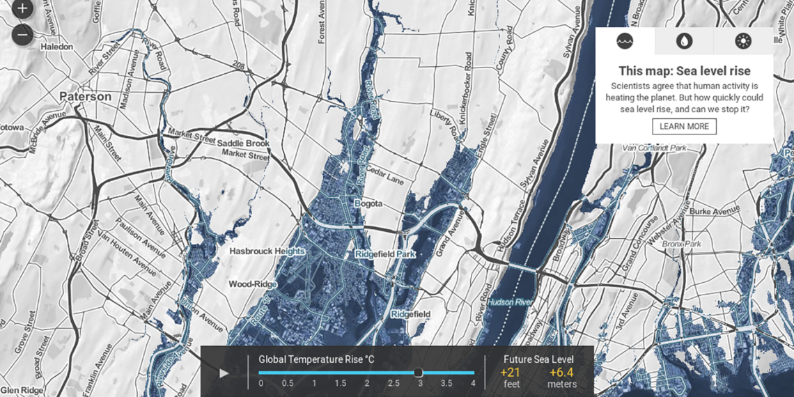 Язык сайта — английский, но разобраться сможет любой. В нижней части карты есть ползунок, показывающий рост глобальной температуры. Его можно перетаскивать в диапазоне от 0 до 4 °С и наблюдать, как меняется уровень моря, на панели сбоку и на самой карте. Лучше всего изменения заметны на берегах.