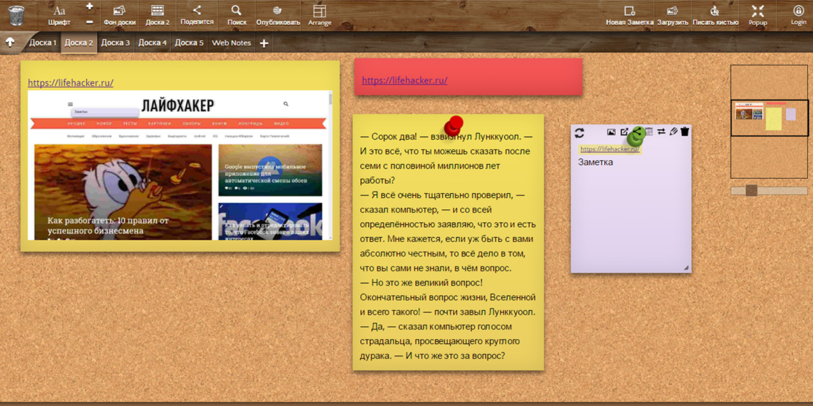 Также приложение позволяет сохранить URL страницы или её миниатюру. Кроме того, если вы выделите любой текст, то его при помощи двух кликов можно закрепить в виде заметки на одной из досок расширения.
